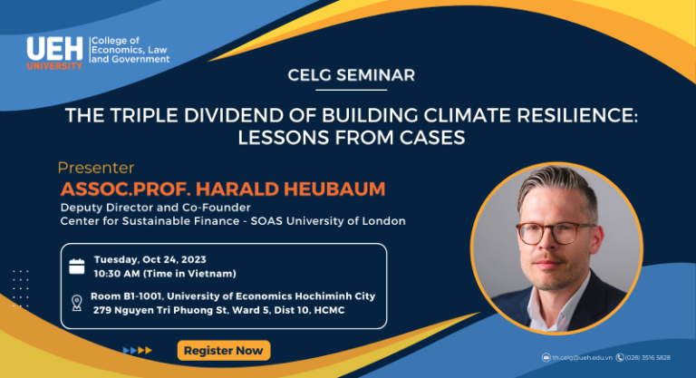Dear Lecturers, Researchers and Students, The College of Economics, Law and Government would like to respectfully invite lecturers/ researchers to come and share your experiences at the CELG seminar: Topic: The Triple Dividend of Building Climate Resilience: Lessons from Cases Presenter: Assoc.Prof. Harald Heubaum, Deputy Director and Co-Founder,…
