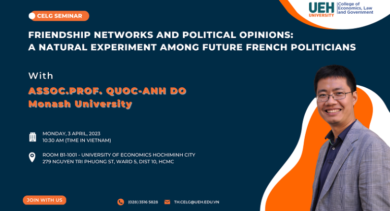 The College of Economics, Law and Government would like to respectfully invite lecturers/researchers to come and share your experiences at the CELG seminar: Topic: Friendship Networks and Political Opinions: A Natural Experiment among Future French Politicians Presenter: Assoc.Prof. Quoc-Anh Do, Monash University Time: 10:30 AM (Vietnam), Monday, April 03,…