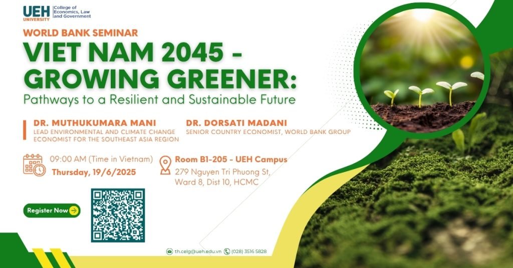 The College of Economics, Law and Government would like to respectfully invite lecturers/ researchers to come and share your experiences at the seminar on “Vietnam’s Pathways to a Resilient and Sustainable Future” featuring insights from the World Bank’s latest analysis on Vietnam’s green growth ambitions and climate resilience strategies.